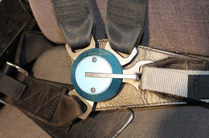 Each front seat was longitudinally adjustable and equipped with a 4-point safety harness consisting of a lap belt and automatic locking shoulder harnesses (Photo 2). The 3-person fixed-position rear bench seat was equipped with a 3-point safety harness for each seat, the shoulder harness was not an automatic locking type. The design of the front and rear seat belt system was such that the seat belt buckle latch had to be raised to insert the metal tongues on the lap belt and shoulder straps. Closing the buckle latch locked the 4 belts together. Lifting the buckle latch released the seat belt system.