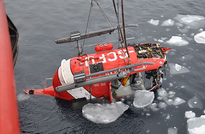 At 1738, CCG364 informed the CCGS Amundsen that it would be arriving in 10 minutes. When the helicopter had not arrived, its position was checked on the flight following system at 1805, which was displaying the helicopter's position as 3.2 nautical miles from the vessel. Starting at 1818, the CCGS Amundsen's crew attempted several times to communicate by radio with the pilot, without success. At 1824, the vessel proceeded toward the helicopter's last position displayed on the flight following system. At 1847, debris was spotted. The 3 occupants were recovered using the vessel's fast rescue craft; none of them survived. The helicopter sank in 458 m of water. The accident occurred during daylight. No 406-MHz emergency locator transmitter signal was received by the satellite system.