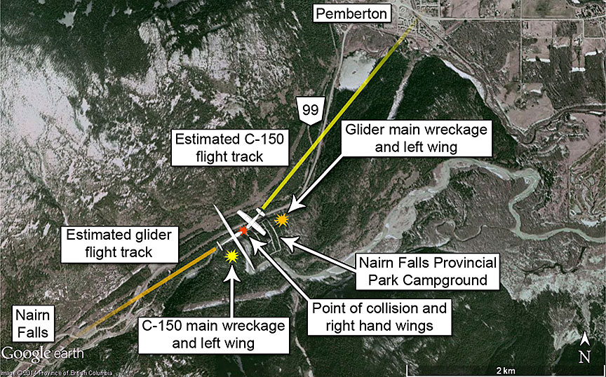 The privately registered Cessna 150F (registration C-FSQQ, serial number 15061702) departed Lillooet, British Columbia, for Nanaimo, British Columbia, with the pilot, 1 passenger, and a dog on board. A privately registered Stemme S10-VT motor glider (registration C-FHAB, serial number 11-016) was inbound to Pemberton, British Columbia, after a local sightseeing flight, with the pilot and 1 passenger on board. Both aircraft were being operated in accordance with visual flight rules. At approximately 1218 Pacific Daylight Time, the 2 aircraft collided about 3 nautical miles west of Pemberton and struck the ground in the Nairn Falls Provincial Park Campsite. There were 2 main accident sites about 0.3 nautical miles apart. Both aircraft were destroyed, and there were no survivors. There was an intense post-impact fire, which consumed the cockpit and engine compartment of the glider. The Cessna engine compartment suffered a small post-impact fire, which self-extinguished. No emergency locator transmitter signals were detected at the time of the accident.