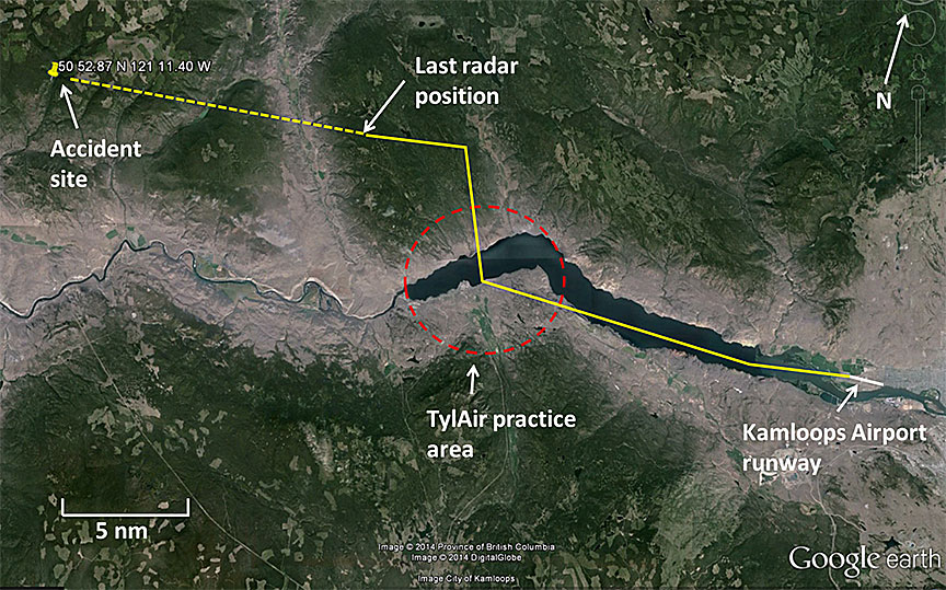 Air traffic services (ATS) radar data indicated that the aircraft initially appeared at 3000 feet asl about 3 nm west of the Kamloops Airport. The recorded flight path exhibited a direct climbing route to the designated company practice area, with some manoeuvres conducted within the area at 4500 feet asl, which was consistent with the training plan for the day (Figure 1). Subsequently, the flight moved away from the practice area to an area about 6 nm north of Kamloops Lake (15 to 20 nm west-northwest of the Kamloops Airport) over higher terrain, and further manoeuvres took place there between 5000 and 7000 feet asl. At about 1057,Footnote 2 a prolonged climb started, combined with manoeuvres. At 1105, radar data showed that C-FQTR was 18 nm west of the Kamloops Airport (about 13 nm east of the accident site) and had reached 9000 feet asl (its highest radar-recorded altitude). C-FQTR then disappeared from the radar display and did not reappear. There were no reports of anomalies with the radar equipment, and no further responses to radar were received from the aircraft transponder. When the aircraft did not return at the scheduled time, the instructor, who was supervising the flight, notified search and rescue services. In the interim, 2 company employees commenced an air search in their private aircraft.