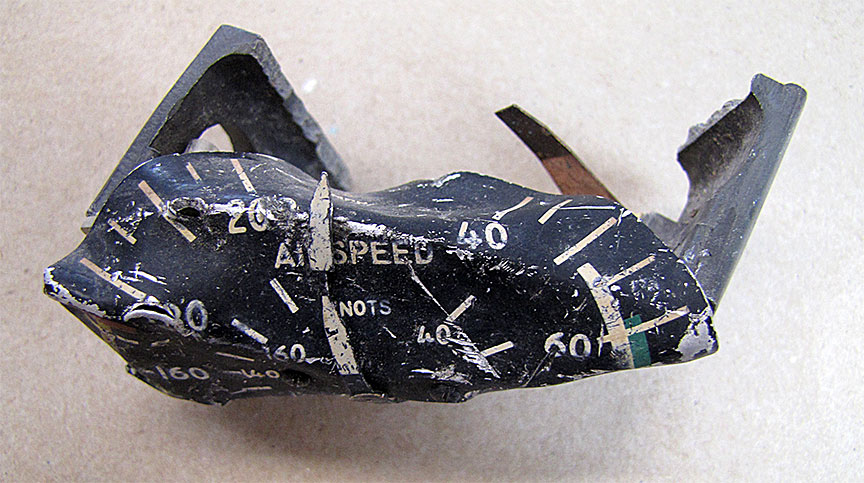Flight instruments were destroyed; however, remnants of the airspeed indicator, altimeter, engine tachometer and Hobbs meter,Footnote 4 turn coordinator, and flap position indicator were recovered and evaluated by the TSB Laboratory. The examination of the airspeed indicator dial face and pointer did not reveal any witness marks; however, it was noted that the pointer, due to the bends in the dial face, was trapped in the region past the 200 mph indication (Photo 1). The normal operating speed range is 59 to 140 mph (manoeuvring speed). The caution range is 140 to 174 mph (the never exceed speed and red line). The highest graduation speed mark on the gauge is 210 mph. The dial face of the engine tachometer revealed witness marks indicating approximately 2550 rpm. The maximum operating speed for the engine at 5000 feet asl is 2600 rpm. The position of the throttle at the time of the accident could not be determined.