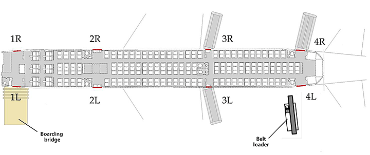 The doors, numbers 1 left (1L) and 1 right (1R), are located in the forward cabin directly behind the cockpit. Doors 2L and 2R are just in front of the wings while doors 3L and 3R are just behind the wings. Doors 4L and 4R are in the aft cabin.
