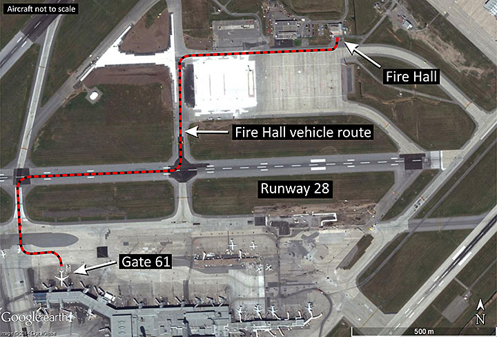 According to ground radar data, the fire trucks left the fire hall and headed to the location of the fire at 1648 and arrived at gate 61 at 1649:50. The 1.8 km trip took 1 minute, 50 seconds (Figure 2).