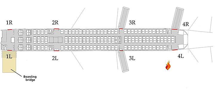 The passengers at the front of the cabin had started deplaning in the usual way via door 1L, the only open door at this point (Figure 1). Several passengers in the aft cabin were standing in the aisles, gathering their personal belongings and carry-on luggage or waiting for the aisle to clear to move towards the front. The cabin crew members assigned to door 1L noticed a burning smell in the cabin. At the same time, a member of the ground crew was banging on the boarding bridge door leading to the outside and shouting to warn the cabin crew about the fire.