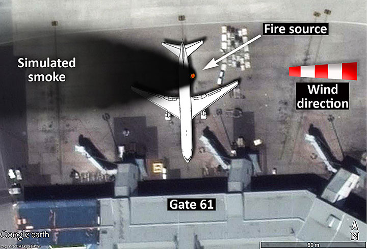 The fire produced thick, acrid black smoke blown towards the right side of the aircraft by the wind enveloping the aft part of the fuselage. Smoke likely entered the main aft cargo compartment since the main aft cargo door was open. The smoke spread into the cargo compartment and moved up to the cabin through the air recirculation fans, which take their air source from between the cargo compartment wall and the outer fuselage skin. At the same time, the air drawn by the auxiliary power unit's (APU) intake probably spread some of the smoke to the ventilation system. This led to the evacuation during which some passengers were injured and had to be hospitalized.