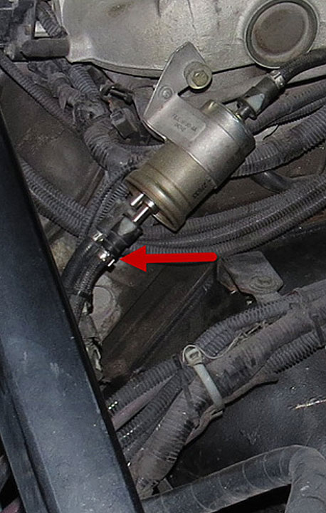 The fuel is then supplied to the various components of the engine's fuel injection system. The fuel filter regulator is mounted behind the intake manifold, leaving it somewhat exposed to the elements and shocks when the belt is in the raised position. High-pressure fuel from the electric pump is delivered to the central connection on the left side of the filter regulator.
