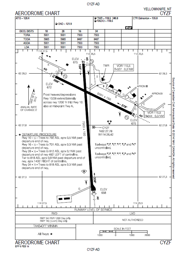 At 1708,Footnote 1 BFL168 received take-off clearance from the Yellowknife tower controller and initiated the take-off run from Runway 16 at the intersection of Runways 16/34 and 10/28 (Appendix A ). The runway distance available from the intersection was approximately 5956 feet.