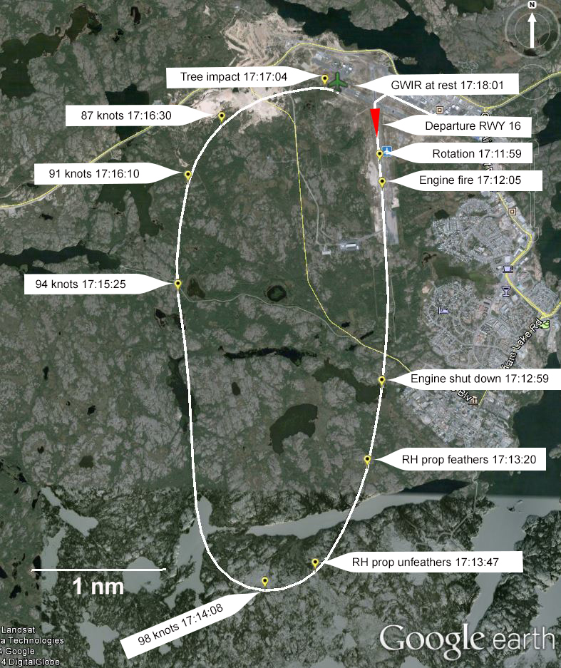 On 19 August 2013, a Buffalo Airways Ltd. Douglas DC-3C (registration C-GWIR, serial number 9371) was operating as a scheduled passenger flight from Yellowknife, Northwest Territories, to Hay River, Northwest Territories. After lift-off from Runway 16 at 1708 Mountain Daylight Time, there was a fire in the right engine. The crew performed an emergency engine shutdown and made a low-altitude right turn towards Runway 10. The aircraft struck a stand of trees southwest of the threshold of Runway 10 and touched down south of the runway with the landing gear retracted. An aircraft evacuation was accomplished and there were no injuries to the 3 crew members or the 21 passengers. There was no post-impact fire and the 406 MHz emergency locator transmitter did not activate.
