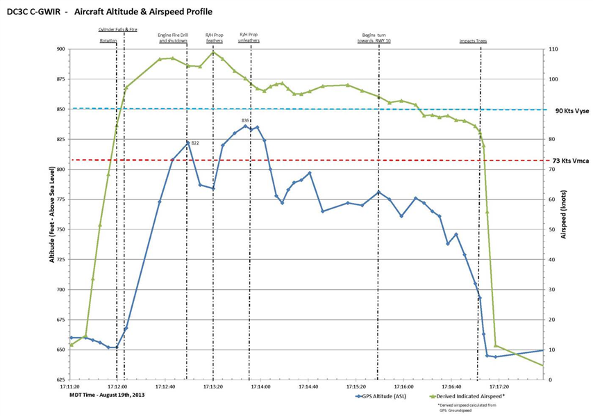 It should be noted that the performance figures in Table 1 are predicated on the most adverse engine inoperative condition. Failure of the left (i.e., critical) engine will produce the more pronounced yaw/roll condition, which would require greater flight control inputs to counteract these forces. As a result of these control inputs, the aircraft will be exposed to greater drag, which will in turn negatively affect the aircraft's performance. Conversely, failure of the non-critical engine may not result in as great a decrease in performance, but a loss in climb performance will still be experienced. Appendix C illustrates the relationship between airspeed and altitude on the occurrence flight after the failure of the right engine and subsequent unfeathering of the right propeller.