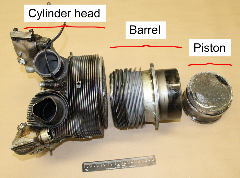 C-GWIR right engine number 1 cylinder head and barrel were found separated due to a fracture of the barrel at the threaded joint with the head assembly (Photo 1). The cylinder head, barrel and piston were forwarded to the TSB laboratory for examination. A pre-existing fatigue crack was discovered in a thread groove on the outer mating surface of the barrel assembly. The cause of the fatigue crack could not be determined due to post-separation damage in the area of the point of origin.