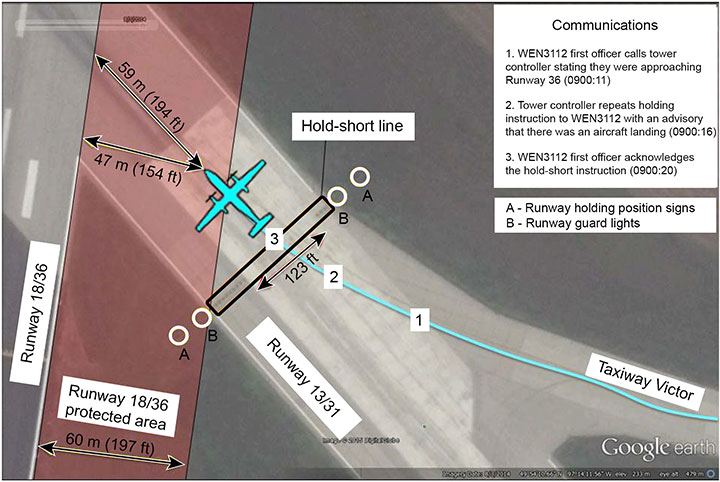 The WEN3112 first officer switched to the tower frequency and advised the tower controller at 0900:11 that they were approaching Runway 36. At 0900:16, the tower controller repeated the instruction to hold short of Runway 36 with an advisory that there was an aircraft landing. The first officer acknowledged the hold-short instruction at 0900:20 (Appendix A – Runway incursion area).