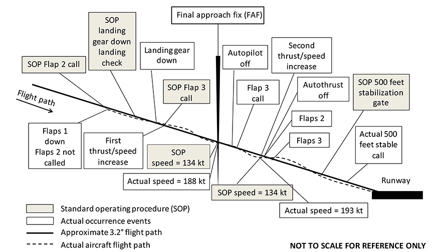 At 1427:02, the aircraft crossed the FAF at the appropriate height (2000 feet) with an airspeed of 188 knots (VAPP plus 54 knots). At that time, the landing gear was down, with flaps 1 selected. According to Air Canada Rouge SOPs for a non-precision managed approach, at this point the aircraft should have been stable at VAPP, with landing gear down and flaps 3 selected (Figure 2).