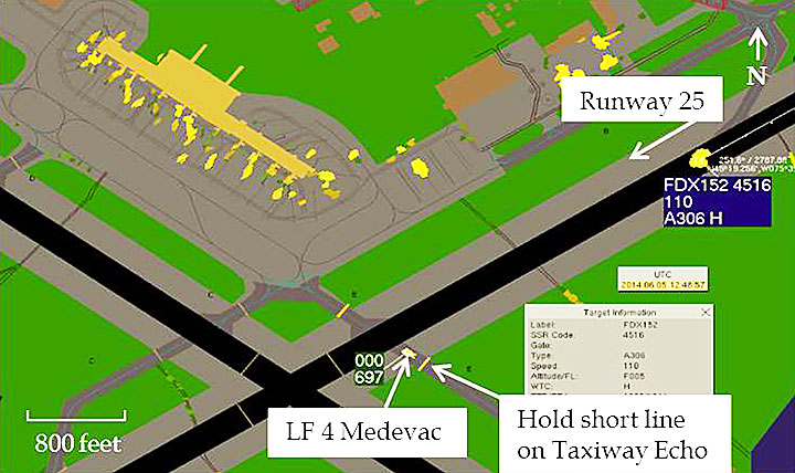When LF 4 Medevac stopped taxiing, FDX 152 Heavy had landed and was decelerating through a ground speed of 110 knots, approximately 2600 feet from the intersection of Runway 25 and Taxiway Echo (Figure 2). The ASDE display showed LF 4 Medevac beyond the hold short line on Taxiway Echo. The helicopter was, however, not on Runway 25; it had stopped just adjacent to it. Approximately 30 seconds had elapsed from the time when the LF 4 Medevac PNF had contacted the tower to when they stopped taxiing.