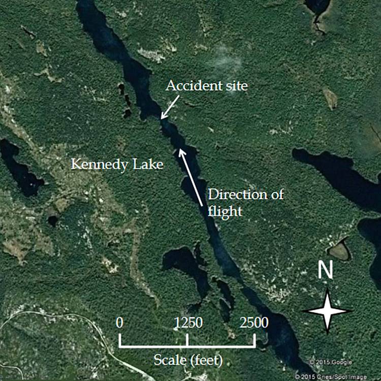 Visual meteorological conditions (VMC) existed at the time of the accident. The 1400 aviation routine weather report (METAR) for Sudbury, Ontario, which is approximately 40 nautical miles south of Kennedy Lake, was temperature 20 °C, dew point 8 °C, wind 020° true (T) at 12 knots, gusting to 19 knots under a mostly cloudy sky. There was no precipitation, and visibility was unlimited. There was no weather reporting station near Kennedy Lake. The pilot reported the wind as variable and gusting from the west. Topography surrounding the lake can affect wind direction and velocity almost instantly on the windward side of the lake. The magnetic variation at Kennedy Lake is 12 degrees west.