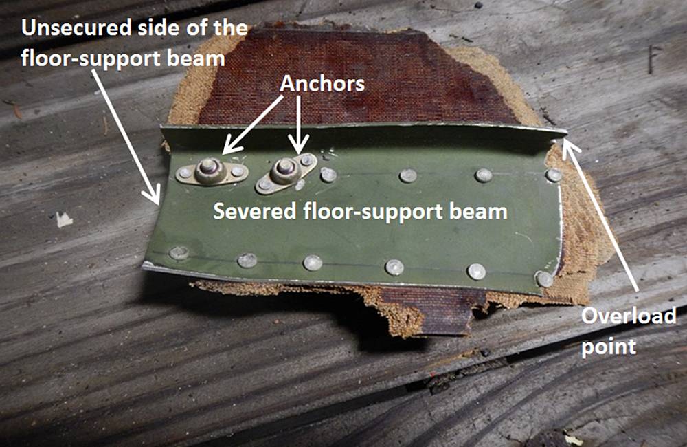 Further examination determined that the rear of the floor-support beam had not been secured or supported, which allowed the seat and its attachment to bend and fail in overload in a forward direction during the impact.