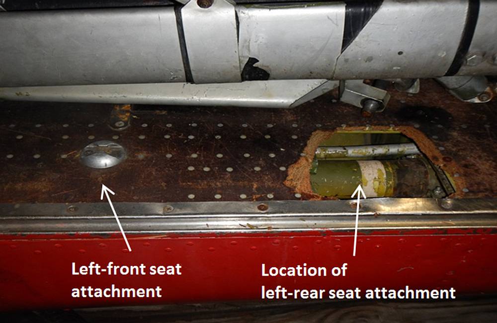 The bench seat and its floor attachments were examined. The bench seat appears to be part of an STC incorporated on the aircraft at some time during its service life. The left-rear of the seat had been attached by 2 anchors through the floor to the floor-support beam. A section of floor containing the anchors as well as part of the floor-support beam were found detached (Photo 2 and Photo 3).