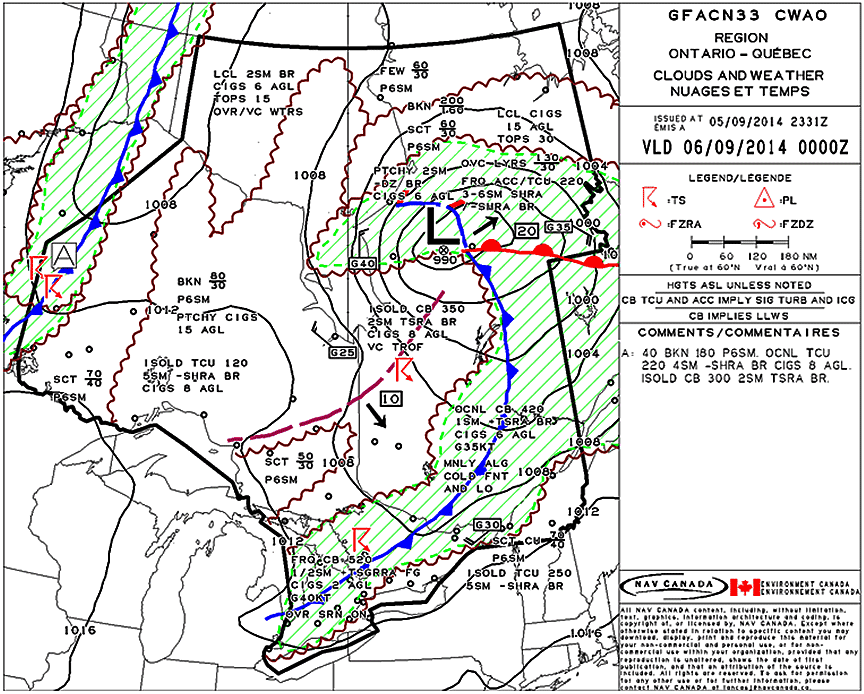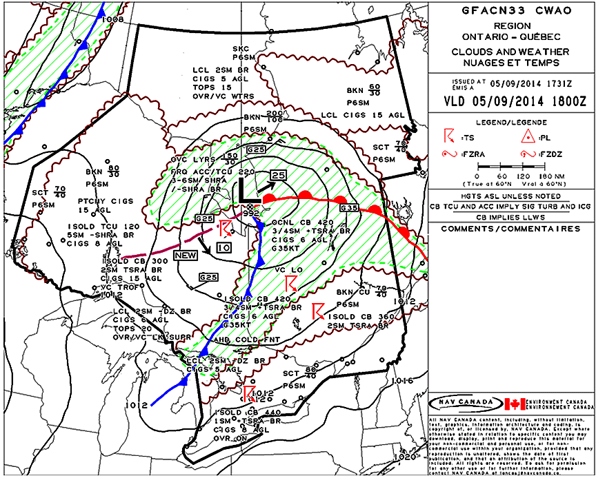 A line of thunderstorms, associated with a cold front, progressed from west to east through southern Ontario during the afternoon and evening on the day of the occurrence. The graphical area forecasts (GFA) covering southern Ontario (GFACN33) issued for the occurrence day (Appendix A) indicated potential for occasional widespread thunderstorms, with tops of 42 000 to 44 000 feet above sea level (asl) at 1400 (1800Z). The GFACN33 issued at 2000 (0000Z) forecasted the following weather along the cold front: frequent cumulonimbus clouds with tops of 52 000 feet asl, heavy thunderstorms, rain, and hail, with winds gusting to 40 knots.