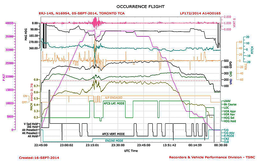 During the period of loss of controlFootnote 11 described in the preceding paragraphs, the aircraft had sustained an average turn rate of 200° per minute, which had changed its heading from 180° magnetic (M) to 240°M, and had reached a peak descent rate of 9300 fpm. Severe turbulence had persisted throughout this period of upset and loss of control. Toronto ACC repeatedly attempted to re-establish radio contact with the aircraft. The flight crew's only response was “stand by,” but this was said with a tone and volume that suggested that something of an urgent nature was occurring.
