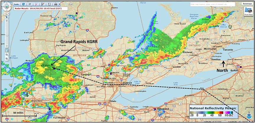 The Environment Canada radar imagery indicated that small lines of thunderstorms began to develop around 1300 along the Ottawa River Valley, extending into central Michigan. By 1600, there was a line of thunderstorms extending from Wiarton, Ontario, into southern Michigan. By 1900, squall lines had developed along the cold front. At 2030, radar images showed rain rates of more than 65 mm/h and cloud tops above 52 000 feet asl.
