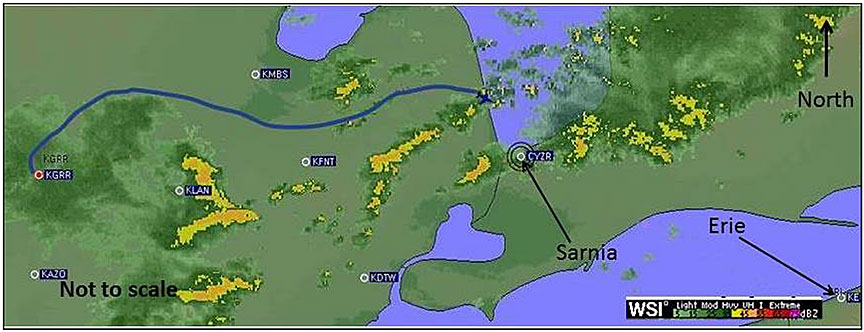At approximately 1914, the dispatcher, viewing the company flight-following/weather softwareFootnote 5 (Figure 2), suggested that the flight crew proceed directly to Chris Hadfield Airport (CYZR), Sarnia, Ontario, and then to Erie International Tom Ridge Field Airport (KERI), Erie, Pennsylvania. The crew then turned the aircraft southbound toward Sarnia.