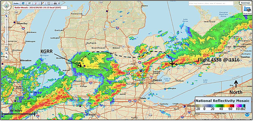 At 1759,Footnote 1 the ExpressJet Airlines (ExpressJet) Embraer EMB-145LR, flight number 4538 (registration N16954, serial number 145072), began manoeuvring at the Grand Rapids Airport (KGRR), Grand Rapids, Michigan, in preparation for departure. Because of local thunderstorms at the airport, a ground stop ensued; as a result, the flight crew were prohibited from manoeuvring the aircraft at the airport. During this time, the pilots viewed the convective activity and precipitation using weather applications on their mobile phones to determine the most viable route for the flight to Newark Liberty International Airport (KEWR), Newark, New Jersey.