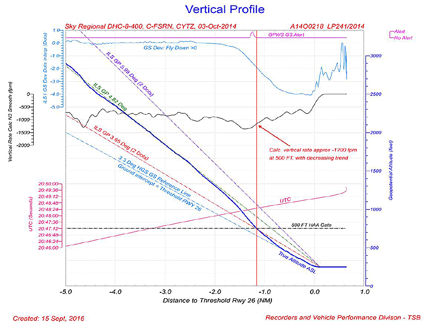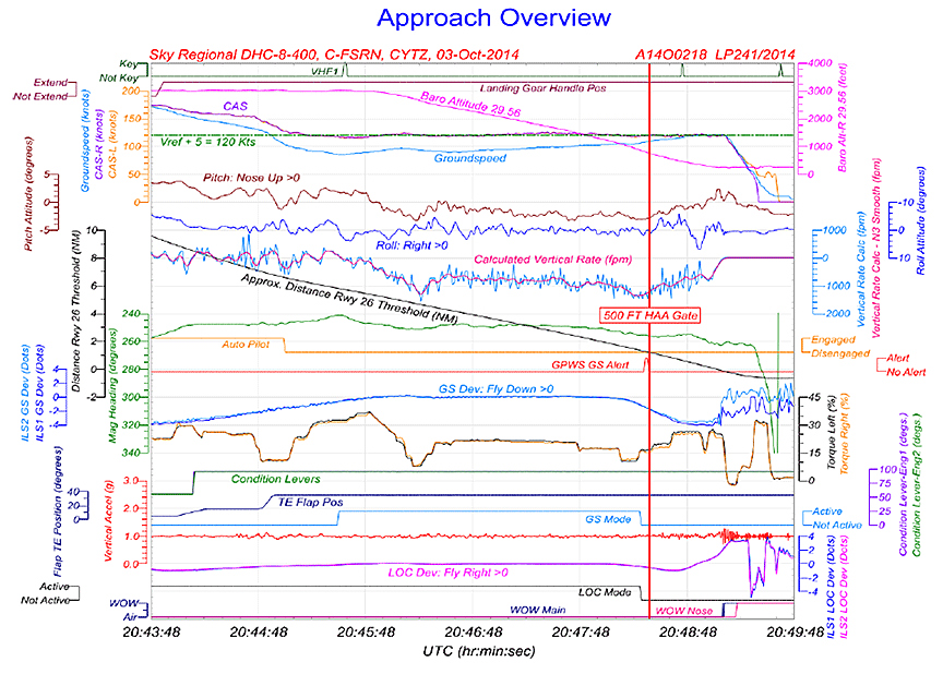 According to company policy, if the stabilized approach criteria are not met between 1000 feet height above touchdown (HAT)Footnote 18 and 500 feet HAA, the PM must call the deviation, and the deviation must be corrected or a go-around performed.Footnote 19 If the criteria are not met below 500 feet HAA, a go-around must be performed.Footnote 20 Due to the lack of cockpit voice recorder (CVR) information, it could not be confirmed whether the deviation calls were made.