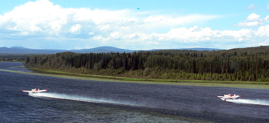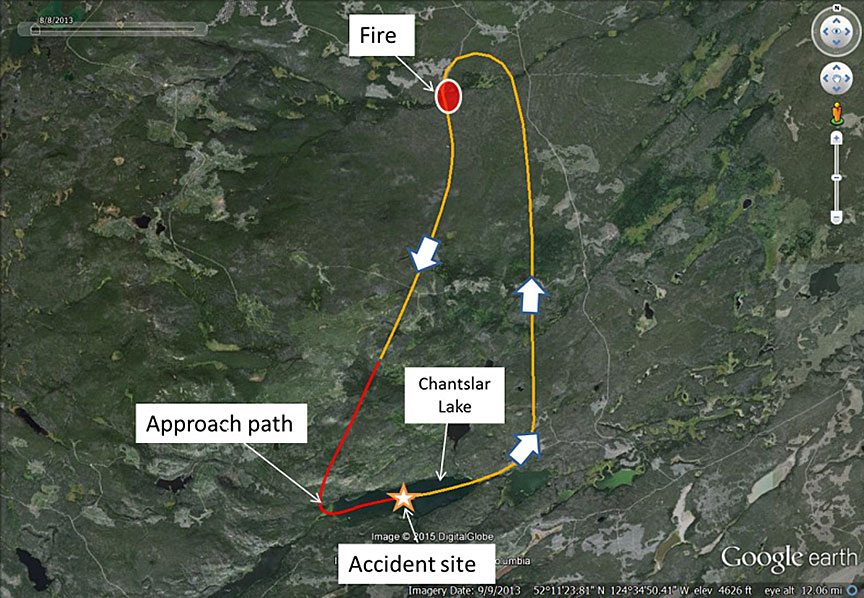 The first flight of the day consisted of 25 scooping runs, dropping a total of 100 loads of fire suppressant agent on the same fire. The group had stopped at 1415 Footnote 1 to refuel and take a lunch break at the Puntzi Mountain Aerodrome (CYPU), 16 nm east of Chantslar Lake, and departed at 1630 with full fuel and full foam Footnote 2 for the second flight of the day. The plan was for the tanker group to continue the same operation.