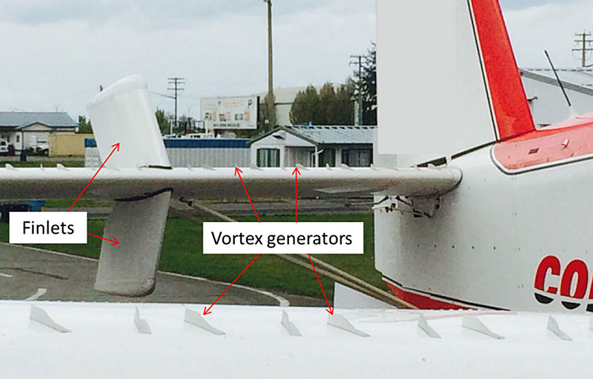 Additional airframe modifications were found to be necessary to return the aircraft flight performance characteristics to regulatory standards in the restricted category. These modifications, collectively known as a stall improvement array, principally included the installation of finlets on the top and bottom of the horizontal stabilizers, a ventral fin under the empennage, and vortex generators on the wings and horizontal stabilizers (Photo 2). In addition, the pitot tube was relocated further outboard and the stall warning vane was repositioned.