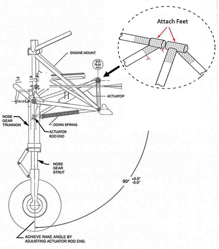 The nose landing gear (NLG) actuator on Piper-46-350P airplanes is bolted via 2 attach feet to the lower aft engine mount, which is constructed of welded tubes. The NLG actuator extends down and forward from the attach feet (Appendix A) and attaches to the NLG. During taxi, takeoff, and landing, the attach feet transmit loads from the NLG to the engine mount, thus creating repetitive stress in the engine mount attach feet areas and, in some cases, leading to fatigue cracking. Mounted on top of the nose gear trunnion are 2 nylon rollers which are used to translate the rotation of the steering arm from rudder pedals movements into rotation of the nose wheel.
