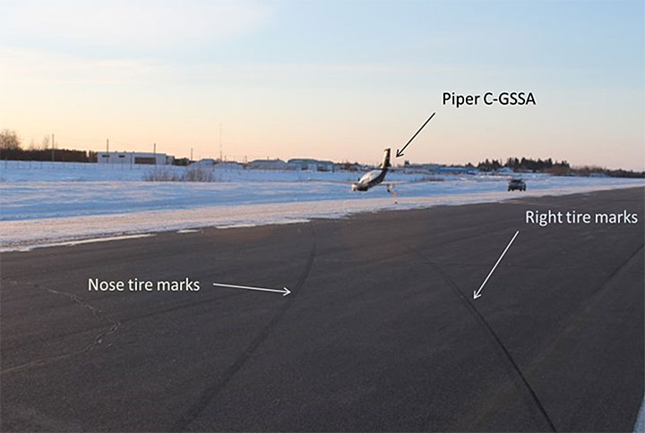 On 23 January 2014, the privately operated Piper PA-46-350P Malibu Mirage (registration C-GSSA, serial number 4636518) departed Montréal International (Mirabel) Airport, Quebec, at 0848 Eastern Standard Time, for Alma, Quebec, with 1 pilot and 1 passenger on board. The flight was uneventful, and the aircraft landed at 1002 on Runway 31. As the nose wheel contacted the runway, directional control was lost. The aircraft veered left and departed the runway surface 400 feet after the loss of control. The aircraft came to a stop about 100 feet from the runway edge in a compacted snow bank, approximately 2200 feet from the threshold of Runway 31. There were no injuries. The aircraft was substantially damaged. There was no fire. The impact forces were not enough to activate the 406 megahertz emergency locator transmitter.