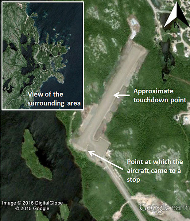 On 28 September 2014, a de Havilland DHC-6-300 Twin Otter aircraft (registration C-GKSN, serial number 493) operated by Air Labrador Limited, was on a charter flight from Lourdes-de-Blanc-Sablon, Quebec, to La Tabatière, Quebec, with 2 crew members and 17 passengers on board. The aircraft touched down about 750 feet beyond the threshold of Runway 23. During the rollout, the captain determined that the aircraft would not stop before reaching the end of the runway, and initiated a high-speed left turn onto the taxiway. The aircraft skidded to the right, and the right propeller struck a runway identification sign before the aircraft came to a stop. The aircraft sustained substantial damage. There were no injuries, and no fire occurred. The 406-megahertz emergency locator transmitter did not activate. The accident occurred at 1512 Atlantic Standard Time, in daylight.
