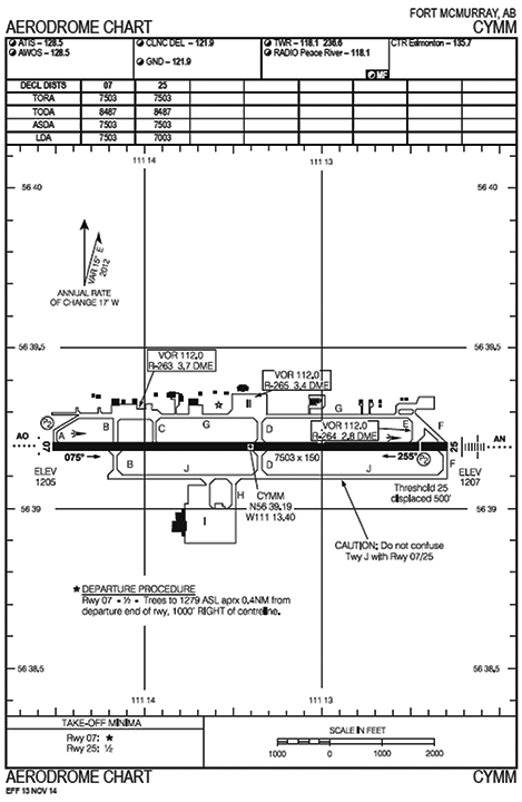 Navigational aids serving CYMM include the Fort McMurray non-directional beacon (MM NDB), the Fort McMurray very high frequency omnidirectional range (YMM VOR) with associated DME, and the IMMFootnote 10 ILS with associated DME. Runway 25 is served by ILS/DME, and area navigation and global navigation satellite system approaches.