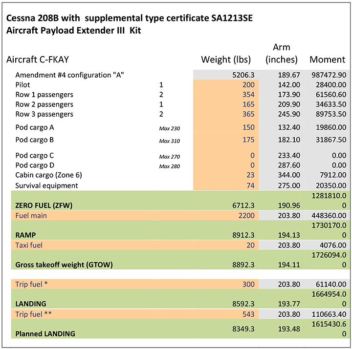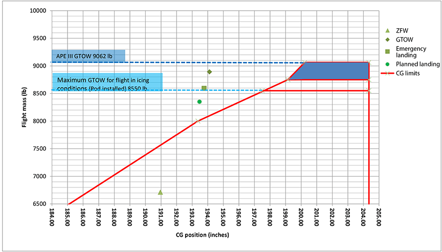 The Cessna 208B has a certified maximum take-off weight of 8750 pounds. Air Tindi operated C-FKAY with the Aircraft Payload Extender III (APE III) system (AeroAcoustics Aircraft Systems, Inc.), installed in accordance with supplemental type certificate (STC) SA01213SE. This system provided an increase in the maximum take-off weight to 9062 pounds and in the maximum landing weight to 9000 pounds. Forward centre-of-gravity (CG) limits were unchanged except for an extension from 199.15 inches at 8750 pounds to 200.23 inches at 9062 pounds. The aft CG limit was unchanged. The maximum weight for flight into known icing conditions with the cargo pod installed was unchanged at 8550 pounds. The pilot did not adhere to the weight-and-balance restriction for icing conditions when loading the aircraft.
