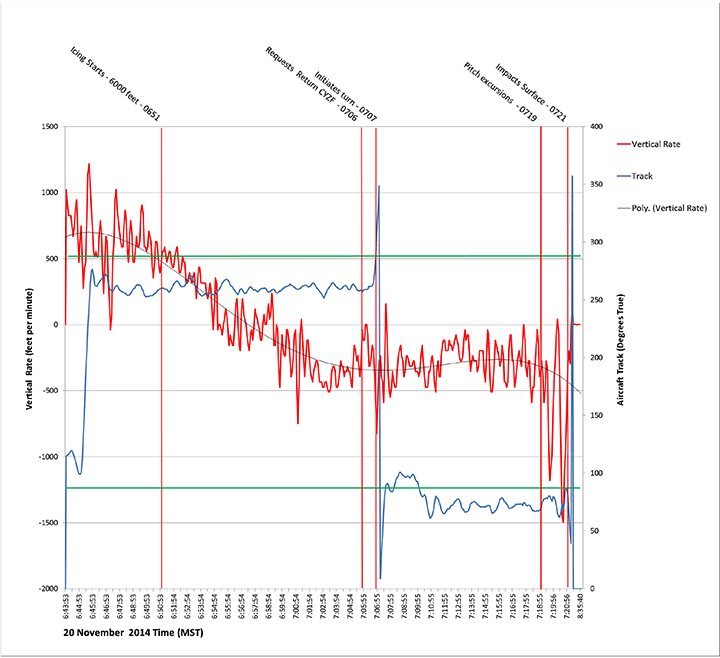 - The severity of the icing conditions encountered and the duration of the exposure resulted in reductions in aerodynamic performance, making it impossible to prevent descent of the aircraft.