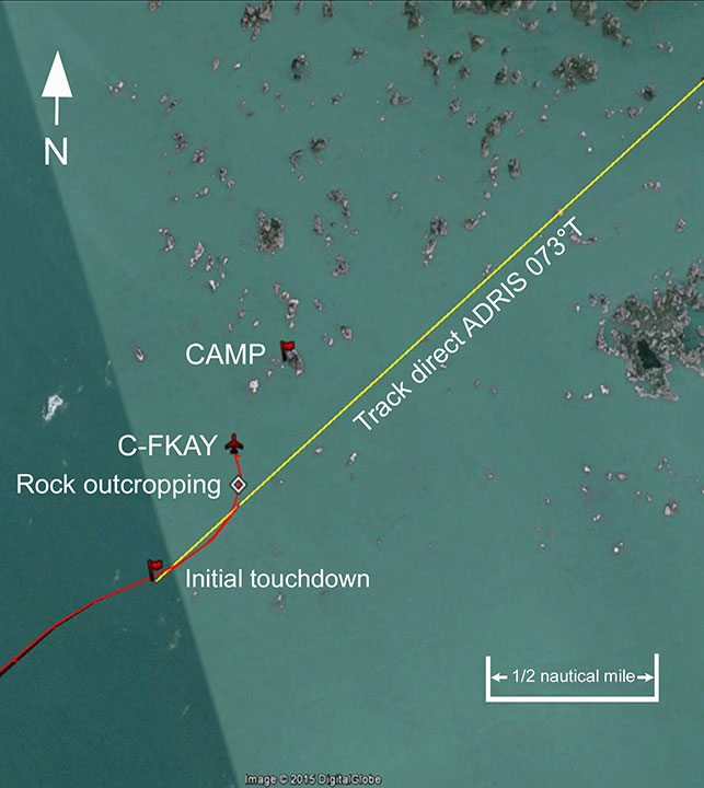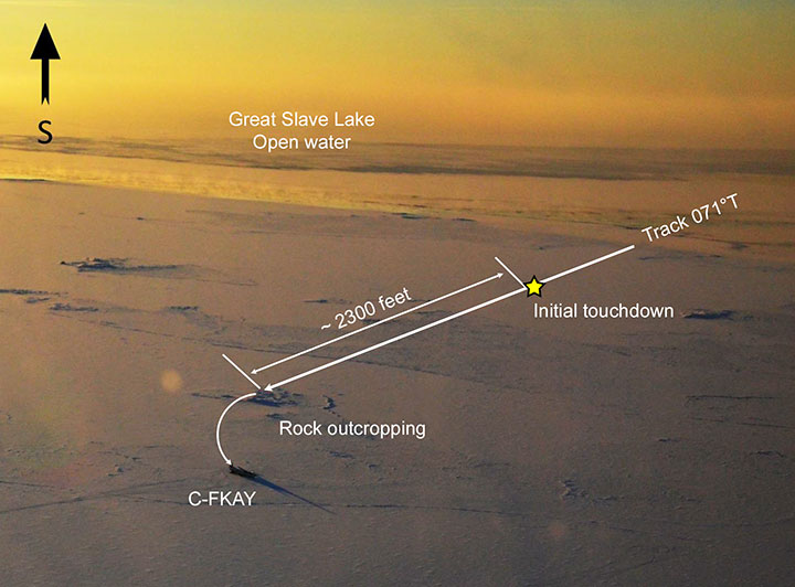 While still in darkness, DA223 contacted the frozen surface of Great Slave Lake at 0721, and continued moving for 2300 feet before it struck a rock outcropping with the nose and left main landing gear. The aircraft came to rest approximately 600 feet from the outcropping and 2900 feet from the initial touchdown point (Figure 1). There were no injuries to the occupants, but the aircraft was severely damaged. There was no post-impact fire.