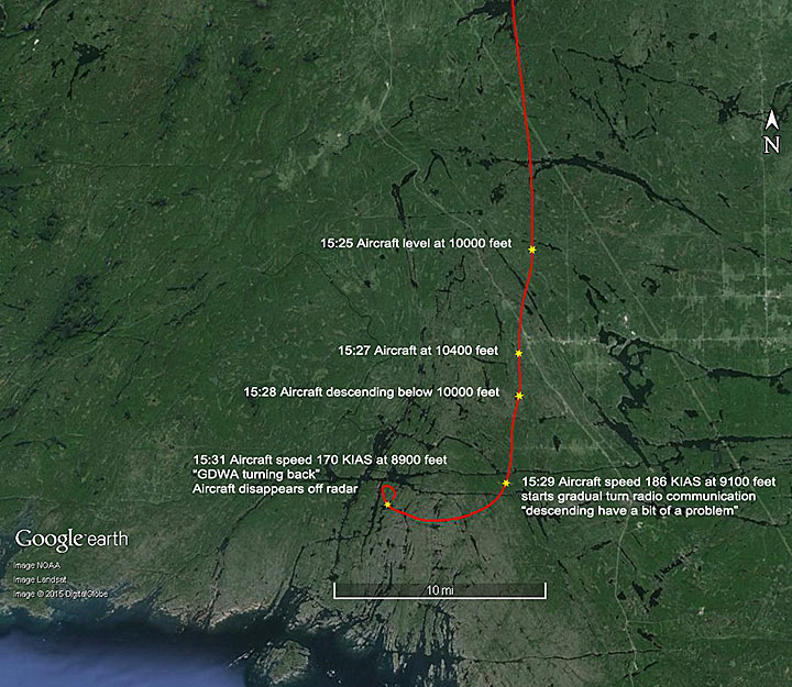 At 1525, the pilot contacted Toronto Area Control Centre (Toronto Centre), advised that the aircraft was level at 10 000 feet asl, and requested the altimeter setting. The aircraft's speed rose to an average of 130 KIAS, and the heading wandered slightly left and right of course.