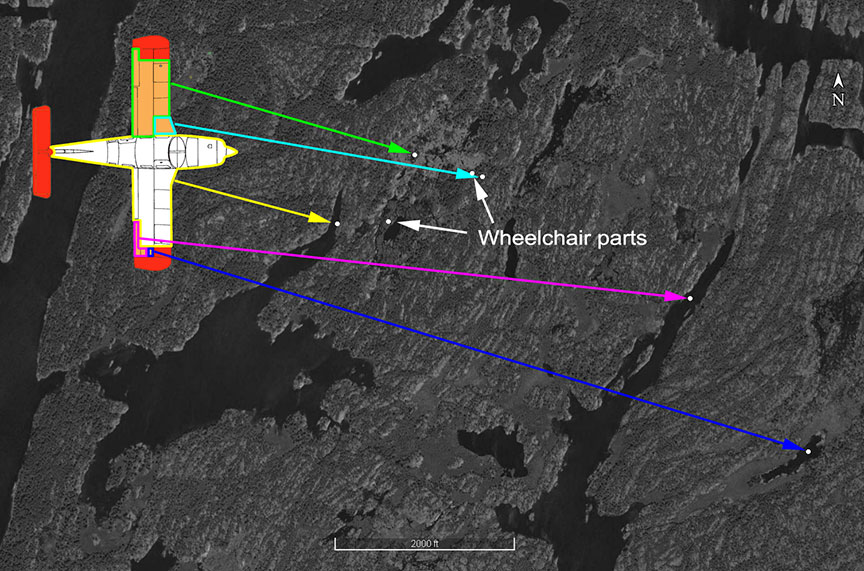 Table 1 lists the aircraft parts and baggage items that were recovered, along with their respective distances and bearings from the main wreckage, and Figure 1 shows their distribution.