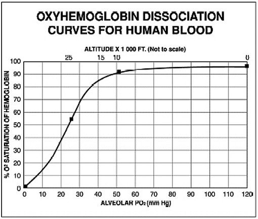 The oxyhemoglobin dissociation curve (Figure 2) reveals that the saturation of hemoglobin with oxygen drops significantly and rapidly above 10 000 feet (3000 metres) asl. Individuals who have a reduced PaO2 even when on the ground due to illness and are then exposed to a further reduction in aircraft cabin pressure at altitude may be brought to the steep part of the oxyhemoglobin dissociation curve. As a result, they may have very low hemoglobin oxygen saturation, which would cause them to experience distress and exacerbation of their underlying illness.Footnote 21