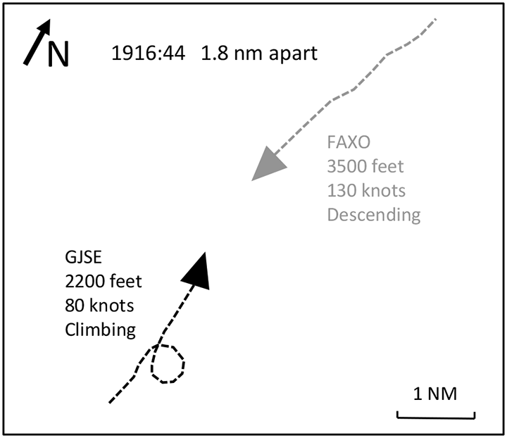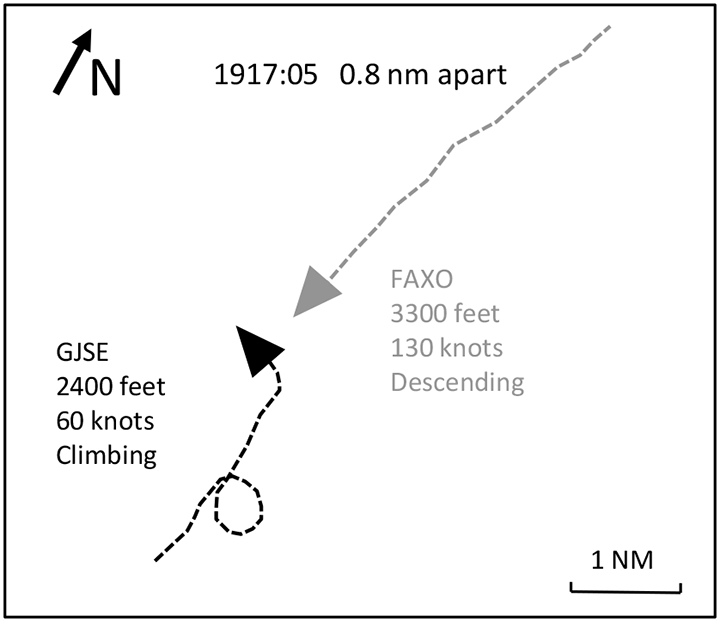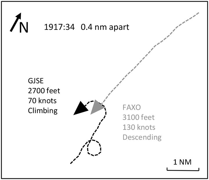The third was at 1917:34, while GJSE was heading southwest on a parallel track to FAXO, 0.37 nm to the right and 200 feet lower. FAXO was overtaking GJSE from behind by 60 knots. Given that GJSE is a high-wing aircraft, its left wing likely blocked the instructor's view of the approaching aircraft. This blockage of the instructor's vision would have likely continued during the left climbing turn in front of FAXO until the collision at 1917:53.