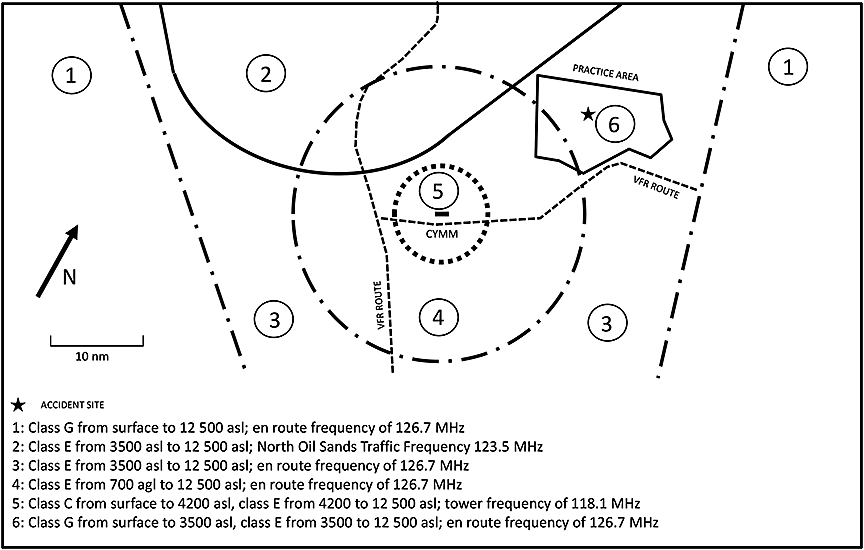 The collision happened in Class G uncontrolled airspace at 2800 feet asl. This uncontrolled airspace lies underneath a Class E control area extension based at 3500 feet asl. A Class E terminal area (controlled airspace) surrounds CYMM from 700 feet agl up to 12 500 feet asl (Figure 4). The Aeronautical Information Manual (AIM) states: