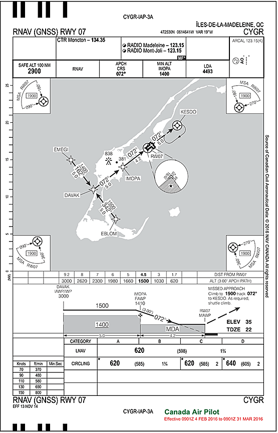Appendix A — Canada Air Pilot approach plate for area navigation (global navigation satellite system) Runway 07 at Îles-de-la-Madeleine Airport (CYGR)