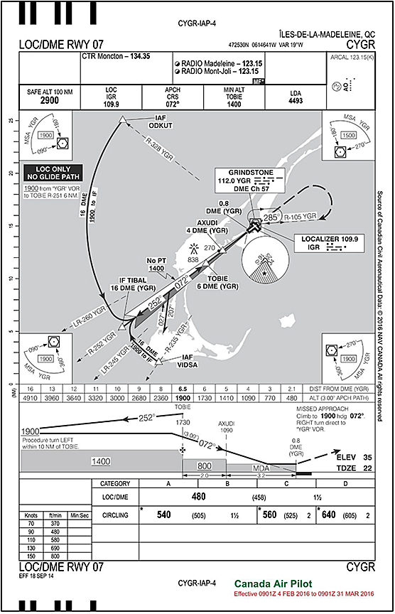 Appendix B — Canada Air Pilot approach plate for localizer / distance measuring equipment Runway 07 at Îles-de-la-Madeleine Airport (CYGR)