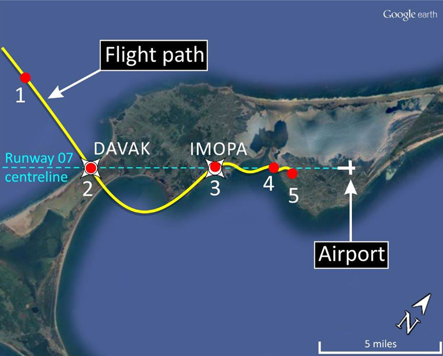 At 1227:14, the aircraft crossed DAVAK on a heading of 114°M at 4500 feet ASL—1500 feet higher than the published procedure crossing altitude. The aircraft was descending at 1600 fpm and at an airspeed of 238 knots—about 100 knots above the recommended approach speed of 140 KIAS. Footnote 12 This resulted in the aircraft deviating significantly from the inbound course of 072° and subsequently proceeding on a meandering flight path.