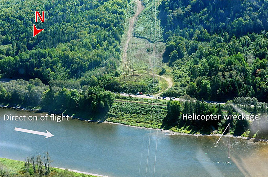 The helicopter broke apart after colliding with the conductor cables and continued on a ballistic trajectory Footnote 3 for about 150 feet before falling into the water near the middle of the Restigouche River.