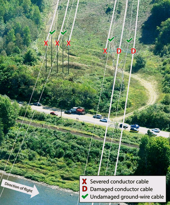 The helicopter severed 4 of the conductor cables and damaged the remaining 2 conductor cables. All of the overhead ground-wire cables remained undamaged (Figure 2).