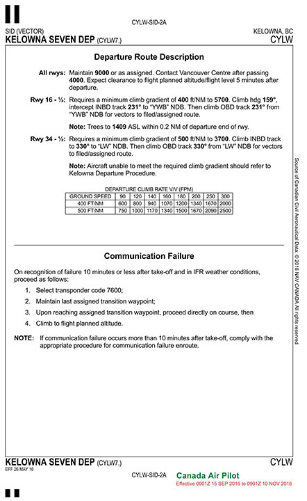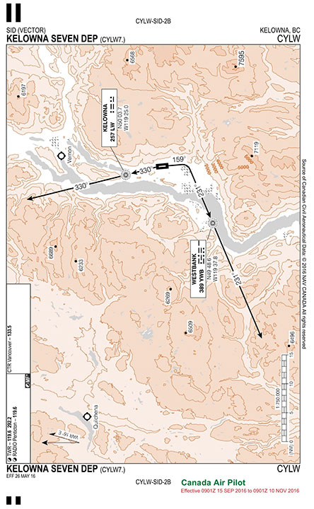 The instructions for the Runway 34 KELOWNA SEVEN DEP SID were to climb to 9000 feet ASL, or to an altitude assigned by air traffic control (ATC), and to contact the Vancouver Area Control Centre (ACC) after passing through 4000 feet ASL. The aircraft was then to climb and track 330° magnetic (M) inbound to the Kelowna non-directional beacon (LW). From LW, the aircraft was to climb and track 330°M outbound for vectors to the filed or assigned route.