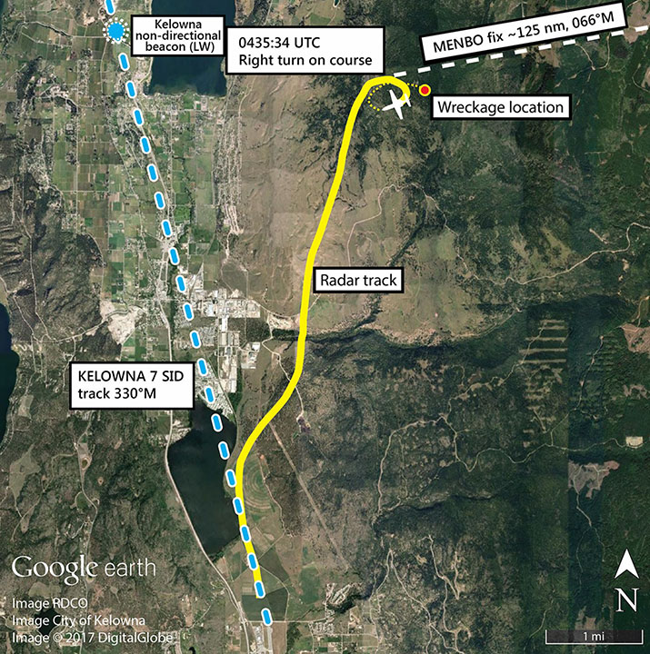 On 13 October 2016, a privately operated Cessna Citation 500 (registration C-GTNG, serial number 500-0169), departed Kelowna Airport (CYLW), British Columbia, on an instrument flight rules night flight to Calgary/Springbank Airport (CYBW), Alberta. The pilot and 3 passengers were on board. Shortly after departure, at about 2135 Pacific Daylight Time, the aircraft made a tight right turn as it was climbing through 8600 feet above sea level, and then entered a steep descending turn to the right until it struck the ground. All of the occupants were fatally injured. Impact forces and a post-impact fire destroyed the aircraft. No emergency call was made, and no emergency locator transmitter signal was detected.