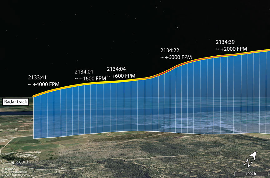 At 2134:22, the aircraft was 2.1 nm beyond the departure end of the runway, and it was climbing through approximately 4800 feet ASL. The aircraft had deviated about 13° to the right of the intended track, and its rate of climb reached its maximum value of approximately 6000 fpm,Footnote 3 with a climb angle of about 22°. The ground speed was roughly 145 knots.