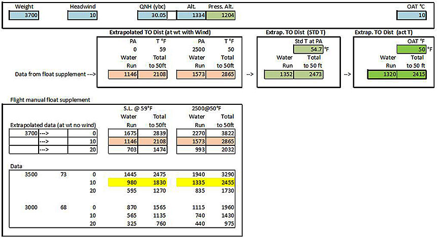 | Linear extrapolation from the table in the floats supplement to the flight manual (3700 pounds) | 1320 | 713 |