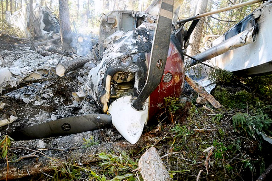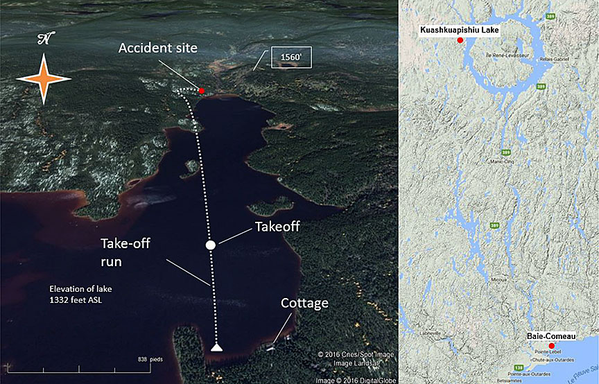The pilot pushed the control yoke forward. The aircraft lost altitude and crashed into a forested area a few metres from the lake tributary (51°30′58.95″ N, 069°12′2.92″W). An intense fire broke out immediately upon impact. Only the pilot, whose clothes were on fire, was able to escape from the wreckage and dive into the river.